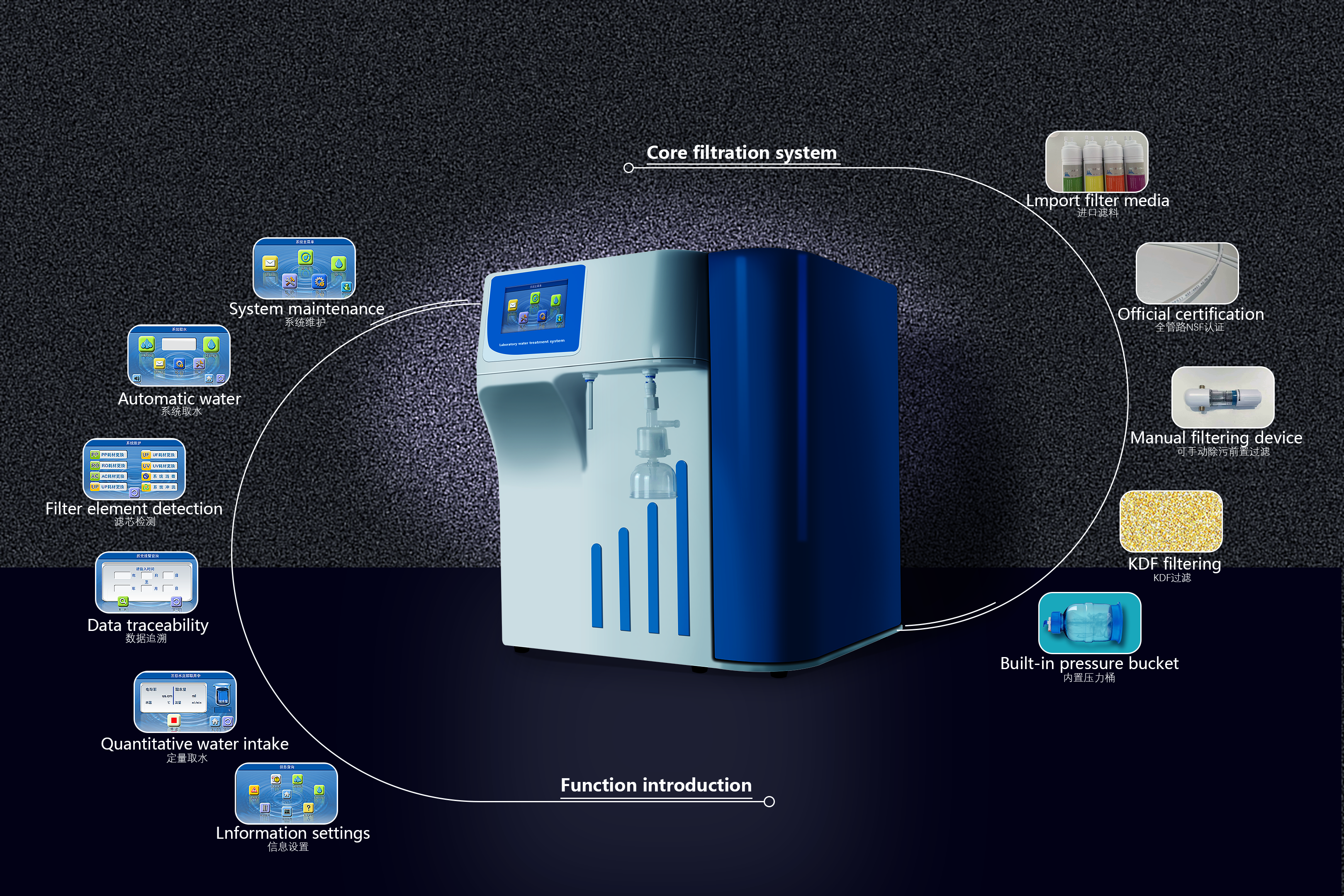 Ø The pipeline adopts a quick-plug interface, the pipe joint passes NSF certification, dual-wavelength UV lamps, effectively sterilizes and reduces TOC, and the original imported 5000D ultra filtration module effectively removes pyrogen.